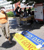 学员告诉人们,中共从1999年开始以“肉体上消灭,经济上截断,名誉上搞臭”的手段迫害法轮功,至今已7年时间了,但法轮功不仅依然存在,而且越来越受到人们认同和支持,法轮功在世界80多个国家和地区洪传,《转法轮》被翻译成20多种语言。