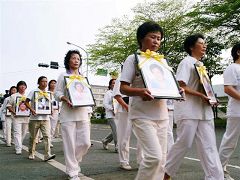 当“酷刑展示车”经过一家饼铺时,一位男孩或许被演示的中共公安的凶残举动吓着了,躲进了母亲怀里,法轮功学员立刻把资料送给这位母亲,并向她详细说明,她点着头说:“今天才知道中共这么残暴”。其后一群穿着素静白衣的女生以整齐的步伐,每人手捧一位大陆受迫害法轮功学员的遗照,气氛显得肃穆哀戚。