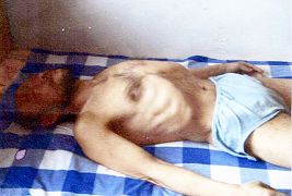 还有一个叫周平的30多岁哈市人,死命折磨我,拼命掰我的四肢并踩我的手和脚。另外十几个犯人也轮番的折磨我,看守所的警察也不管,其中有一个姓宋的管教多次唆使犯人迫害我。当时我已绝食50多天,加上酷刑折磨和野蛮的灌食,一百七十多斤的体重仅剩一百零几斤了,瘦骨嶙峋。随时都有生命危险(附照片)。