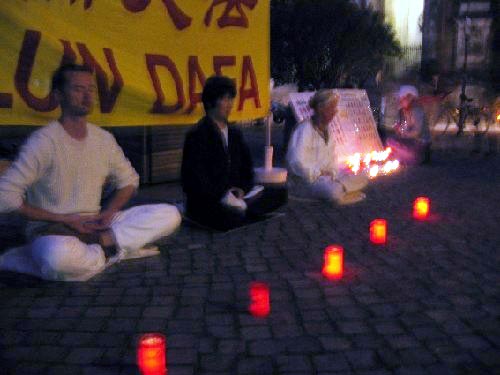 大约在晚上八点时,天完全暗下来。法轮功学员们点亮蜡烛,开始了烛光守夜。尽管在此期间下起若干阵小雨,一些蜡烛被风吹灭,但是烛光守夜深深吸引了行人的目光,他们在展台前停下脚步观看。夜深了,光线更暗了,展板上的字也更难看清了,即便如此,行人还是驻足停留,他们径直走向展板,凑上前去阅读——昏暗的光线对他们根本不造成任何干扰。