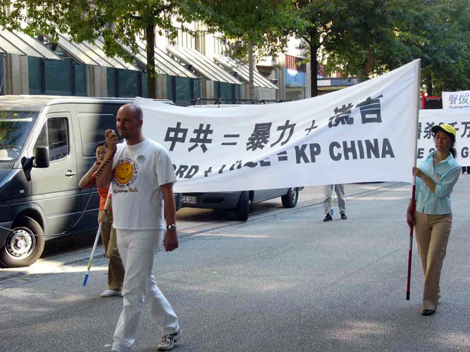 一个西方人在游行队伍中拿着话筒告诉满腹疑问的人们:“我们都知道在中国至少有二千多个集中营、劳教所,那里人们被奴役。但是您可能还没有了解到,今年三月我们得知在中国大量的集中营里,法轮功学员和异议人士被根据需要活体摘取器官,年轻鲜活的生命被作为活体器官库,随时可以被开膛剖肚。”现场录音(德语):lautsprecherm.p3(974KB)