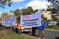 【明慧网二零零六年九月十九日】二零零六年九月十一日,澳大利亚法轮功学员再次来到新加坡使馆前举行活动,抗议新加坡警方以“非法集会”等莫须有的罪名对新加坡法轮功学员提出指控。澳大利亚法轮大法学会向新加坡使馆递交了一封公开信和关于中共活摘取法轮功学员器官的加拿大独立调查报告,以及中英文的《九评共产党》等材料。该信由新加坡使馆保安人员接纳,并承诺把这封信转交给新加坡政府。澳大利亚法轮功学员呼吁新加坡当局不要做中共的帮凶,应立即撤销对十二名当地学员的无理控诉,停止参与法轮功。
