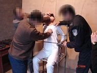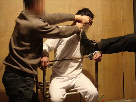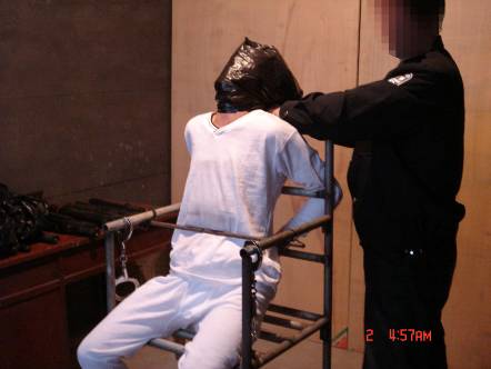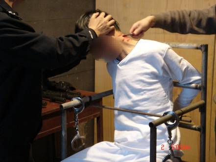 恶警把雷明抬到铁老虎椅上,然后把雷明的双脚绑紧,用铁棍横穿老虎椅扶手,用锁头把椅子锁死。然后将雷明双手反背,两腋窝卡在椅背上,然后用一条牛皮带从手铐中间穿过,经椅子腿的横穿上绕上来,两恶警恶狠狠的使劲地往下拉牛皮带,其中一个气急败坏的恶警用脚猛踹手铐。