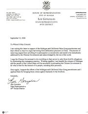 冈萨雷斯在信中再次表示支持密西根州法轮功学员的努力,并赞扬他们把这件反人类的罪行摆到世人瞩目的焦点。