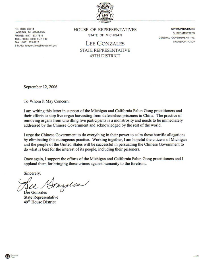 冈萨雷斯议员在信中表示,他写这封信是为了支持密西根州的法轮功学员,支持他们为了制止在中国发生的从毫无防备能力的被监禁人员身上活体摘取器官而付出的努力。他说,“从不情愿的活人身上摘取器官的行为是极其丑恶的,中共政权应当立即作出解释,全世界的人都应当知道这件事情。”