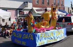 当法轮功学员的花车经过主席台时,主持人大声宣布:“这里我们迎来了‘法轮大法’,教导‘真、善、忍’的平和功法……”。伴随着阵阵掌声,观众们纷纷举起相机,摄下学员们祥和的炼功场面。