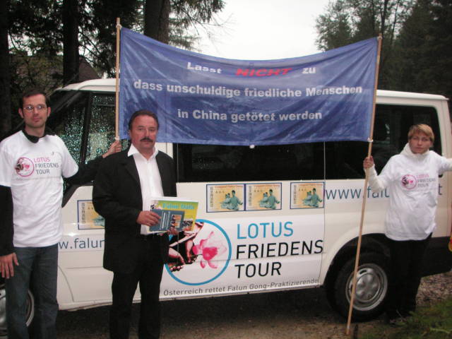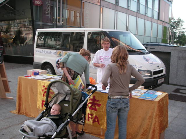 第一天的第二站,是卡尔腾省(Kärnten)的克拉根福特(Klagenfurt),正值奥地利总理大选,竞选展位离学员的展位很近。学员把法轮功的真相材料亲自交给了总理候选人阿发雷德•古森保(Alfred Gusenbauer)博士。他对学员说,已经知道法轮功在中国遭迫害的情况,并祝学员们反迫害成功。卡尔腾省的女省长咖比•少宁波(Gaby Schaunig)也得到了法轮功的真相资料。