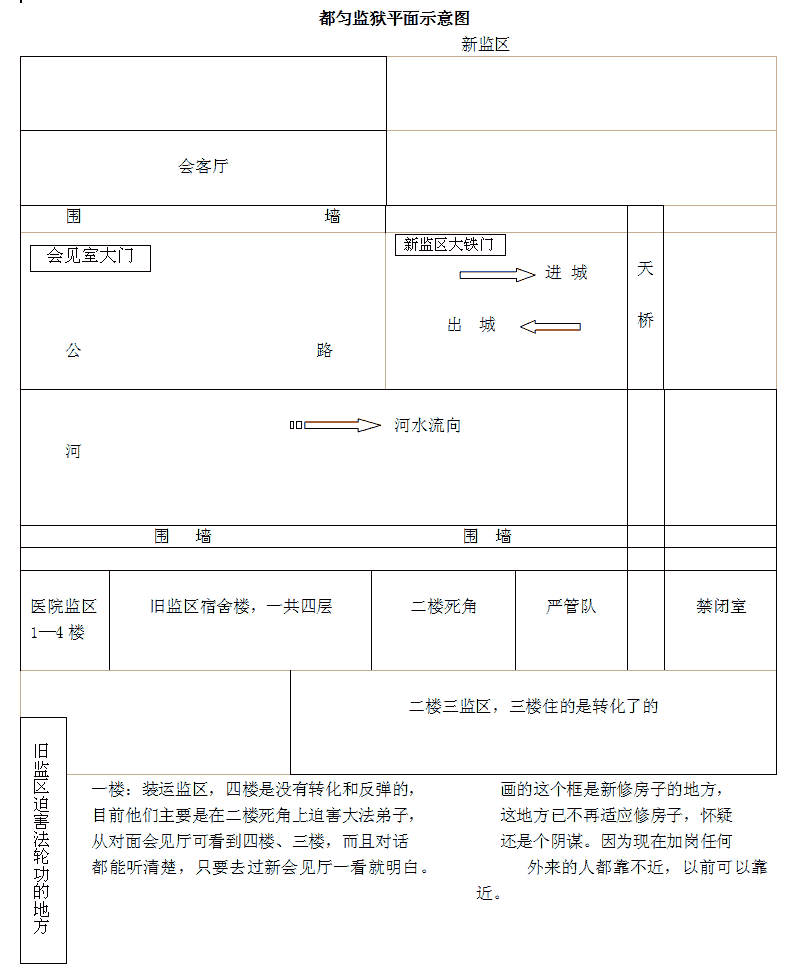 目前他们在死角上修房子,看到“苏家屯”活摘法轮功学员器官事件后,我想起来,这之前就有包夹犯人说要从北方转来法轮功弟子到都匀监狱来,所以我把都匀监狱平面粗略的画出来。恶人王华川现任四监区长,钟山任副监区长。
