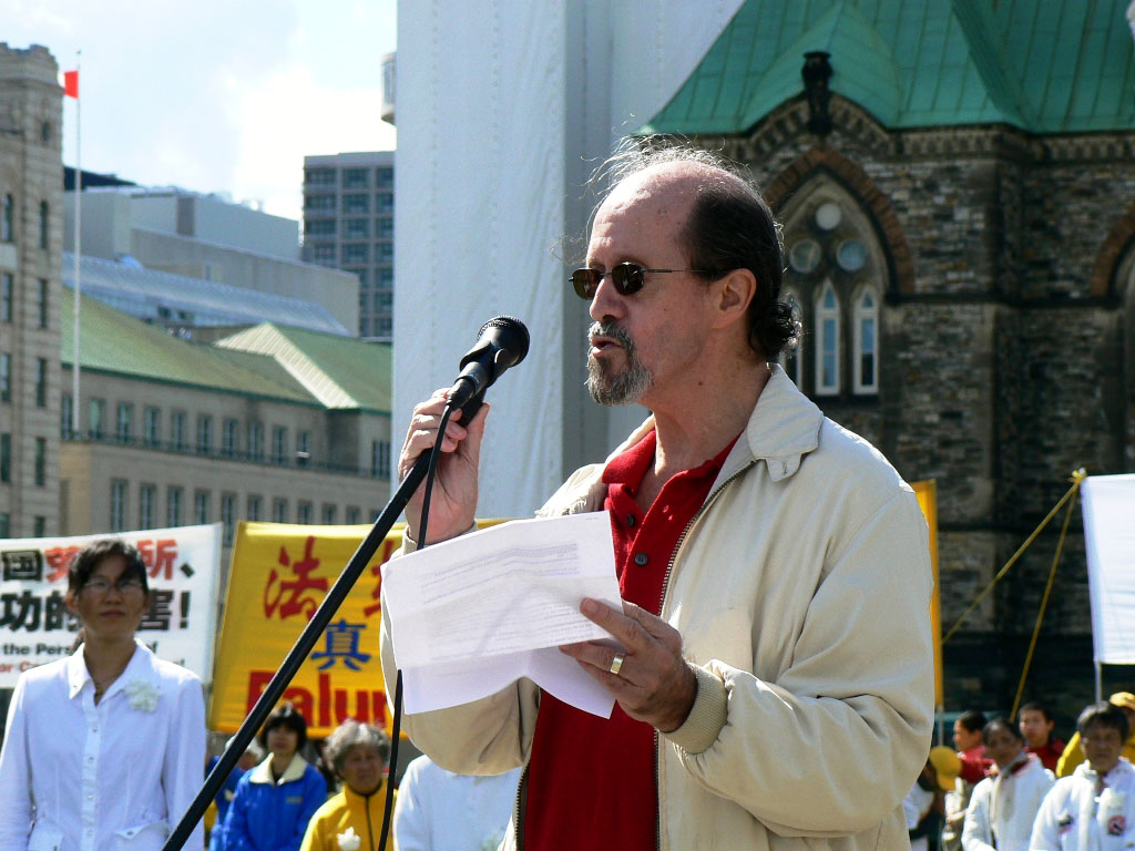 ![]() 资深外交官麦克亚当在“停止活摘法轮功学员器官”集会中演讲 |