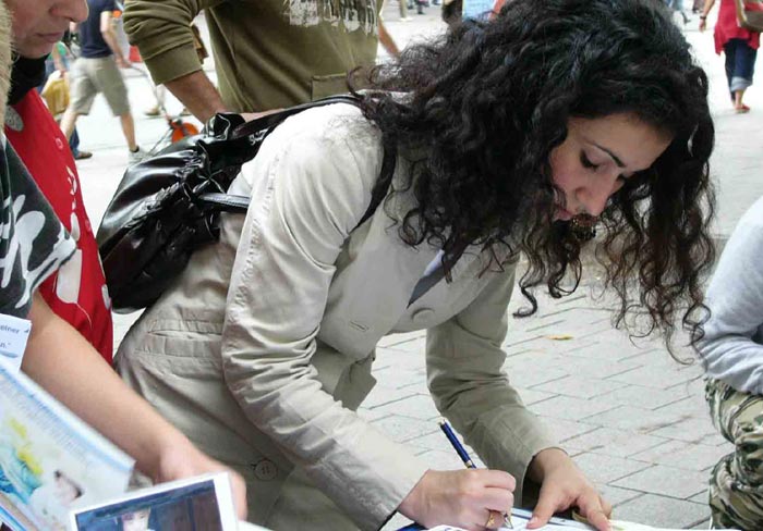 九月二日中午,德国汉堡学员再次来到市中心的伊达埃尔广场(Ida Ehre Platz),继续向汉堡市民讲真相,揭露中共活摘法轮功学员器官的罪行及李岚清和薄熙来的对此负有的责任。了解真相后要求在征签表上签字的人从未这样多过。人们或直奔展台要求学习炼功动作,或想知道法轮大法和其它功法的根本区别,或询问如何可以帮助学员停止迫害。人们往往索取资料后还站在咨询台前不想离去。