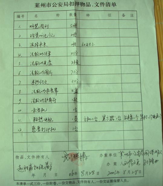 第二天下午两点多,三名大法弟子家同时被抄。孟祥春家被抄两次;魏春兰家是由村书记曹继青带着四、五个不明身份的人,抄走大法书《转法轮》大小各一本、新经文一套(三本)和其他讲法几本、师父法像一张、许多真相、VCD大小各一台(580元)、MP3一个(370元)、大(21寸)小(7寸)电视各一台(990元)、罗盘一个(40元)、讲法带两套(120元)、讲法光盘一套(45元)。