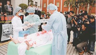 ![]() 中共活体摘取法轮功学员器官的模拟手术场景 |