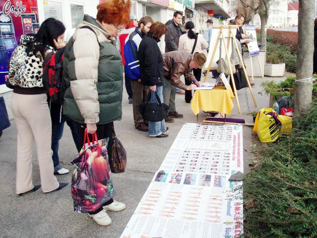 【明慧网二零零七年一月十五日】二零零六年十二月九日星期六,斯洛伐克的法轮功学员在米嘉瓦市(Myjava)的斯特凡尼广场(Stefanik Square)搭起征签桌,设置信息展板,向米嘉瓦的人们介绍法轮功真相和发生在中国的中共对信仰“真、善、忍”的法轮功学员超过七年的残酷迫害