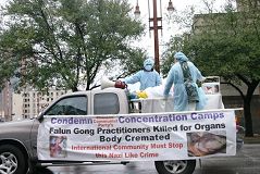 法轮功学员今年参加游行的主题是“揭露中共迫害,揭露中共活体摘取法轮功学员器官”。第一部汽车上面的手术台,模拟展示中共活体摘取法轮功学员器官的罪行,汽车两旁有英文横幅,上面写着“抗议中共活体摘取法轮功学员器官,呼吁国际社会终止中共纳粹的罪行”,还配有图形,将中共邪恶的本质暴露在光天化日之下。这一情形,震撼着观众的心:中共在中国到底干了些什么?另一部汽车上是法轮功学员展示“缓、慢、圆”的五套功法,与前面的迫害场景形成鲜明对比,引起了观众的深思:这么好的功法,为什么却在中国受到打压?