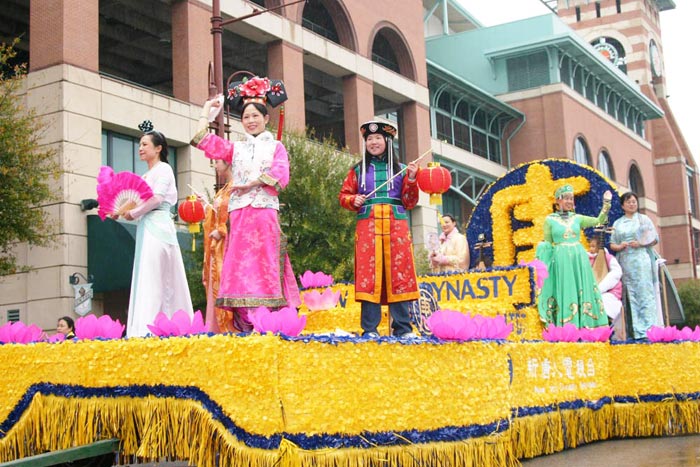 另一辆特别引人注目的花车来自新唐人电视台,展现了全球华人新年晚会的特色,全球华人新年晚会突出中国五千年来最精华的传统文化特点。