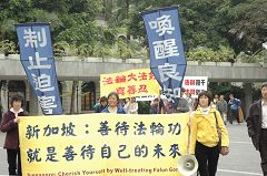 抗议的学员在领馆外张起横幅,正告新加坡当局:善待法轮功,就是善待自己的未来。其中一名学员卢洁说:“新加坡政府面对中共对法轮功学员的残酷迫害,不是站在正义的一面制止迫害,而是助纣为虐,协同中共在新加坡迫害法轮功学员,这是耻辱。我们在这里奉劝新加坡政府,为了你们自己的未来,为了你们家人的未来,为了新加坡人民的前程,必须立即停止对法轮功学员的迫害,否则天理不容。”