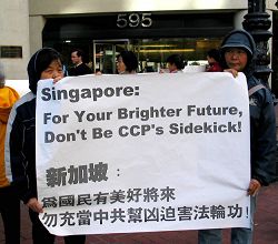 ![]() 部份湾区学员在新加坡驻旧金山领馆所在大楼前抗议其当局不公对待法轮功学员,并吁其停止协助中共恶党迫害法轮功。 |