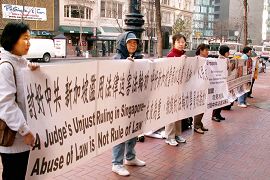 新加坡领事馆位于旧金山金融区繁华地段市场街五九五号大楼内,上午约十一点,部份湾区的法轮功学员到达该大楼前,有的打出中英文横幅,有的散发关于此宗不公案件的传单、和法轮功真相资料。时值中午时分,该大楼前人来人往,路人纷纷阅读横幅上的信息,有的驻足询问详情。