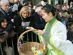 在游行沿途,学员们不停的给观众赠送新年的小礼物——精美的小莲花。每一朵莲花上都连接着印有法轮大法介绍信息的小书签,愿更多的人们能够了解大法,明白真相。