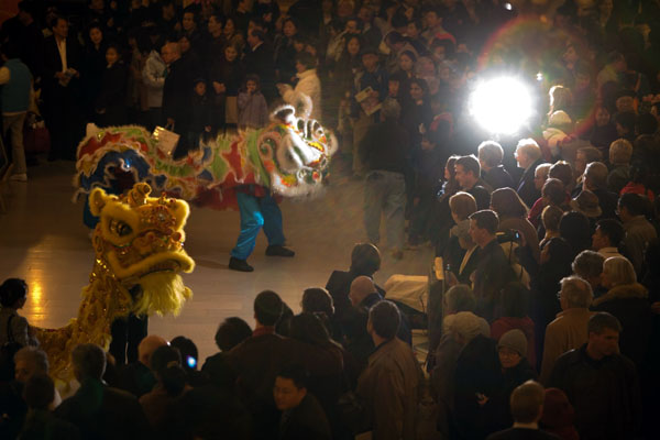 晚会结束后,观众仍不愿离去,继续观赏舞龙、舞狮表演。