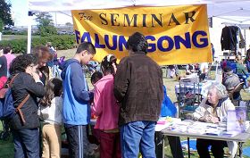 ![]() 集市上法轮功学员的摊位吸引有缘人。 |