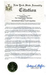 鉴于,本议员荣幸的为新唐人电视台于二零零七年十月十五日至十七日在纽约举办的全世界华人声乐大赛给予嘉奖;并且