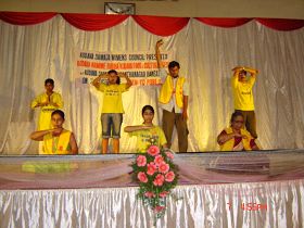 法轮功学员的展位上挂起了横幅:欢迎所有的人了解法轮功。普度和济世音乐为现场带来了祥和、安宁的气氛。一些人前来学习功法;孩子们对莲花着了迷。他们在学会了折叠莲花后才离开。