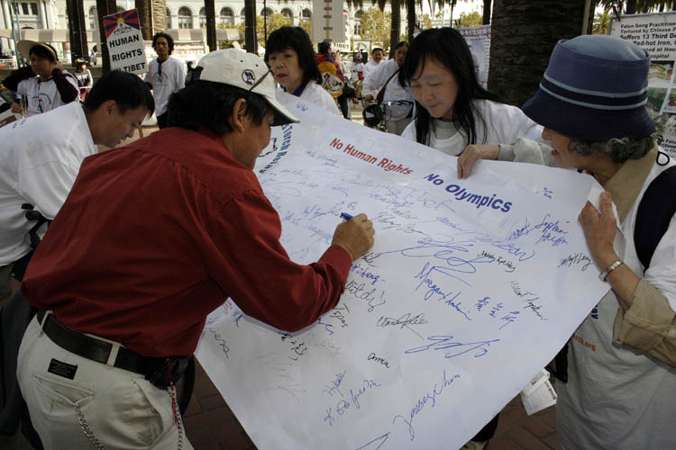 人们签名声援人权圣火活动