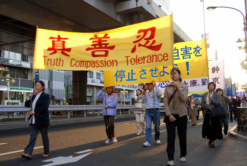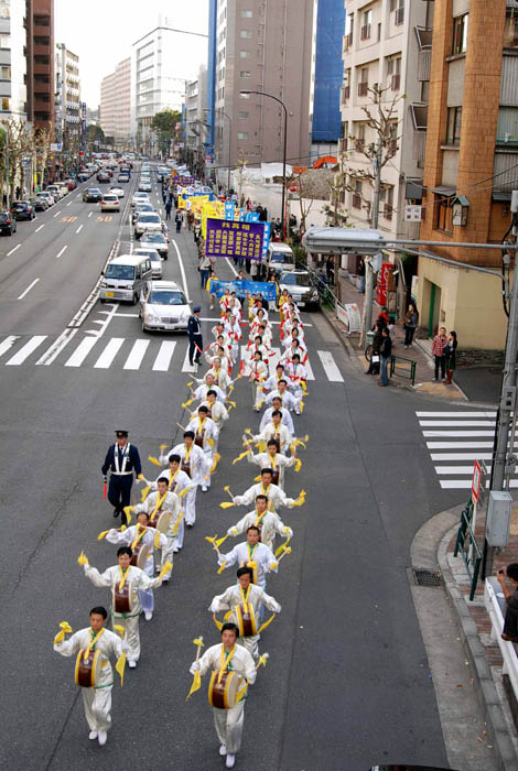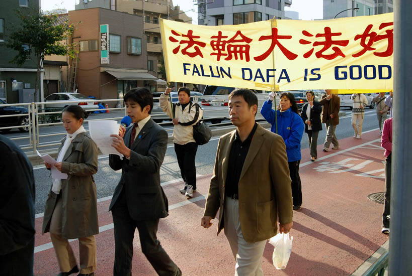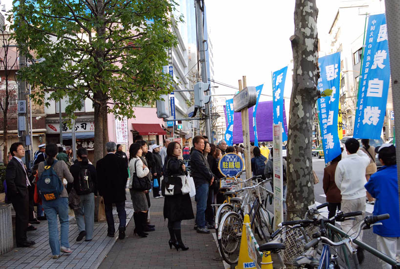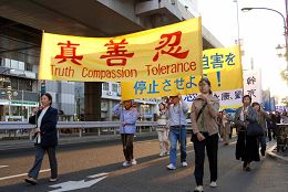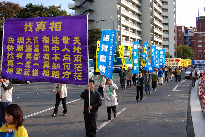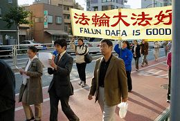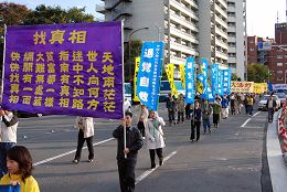 游行进行了二小时四十五分,结束时暮色深沉。二百多米长的游行队伍从惠比寿出发,经过中国大使馆附近,穿越繁华的六本木街头,拐过新桥,在筑地结束。从远而近的锣鼓声、音乐声、口号声,吸引沿途人士聚集观看,有的日本人还跟随队伍一同游行。东京都议员吉田康一郎在游行中手持麦克带喊口号,「停止迫害法轮功」、「声援二千九百万勇士」。一位女士发光了手中的资料,为有的路人没有得到资料而内疚。