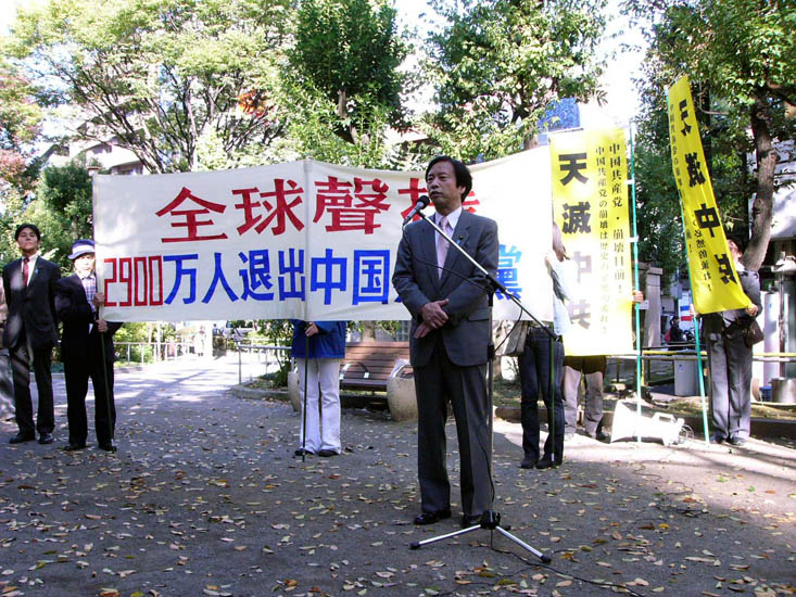 ![]() 东京都议员土屋敬之(左二)、退党中心负责人佐藤国男(左三)、东京都议员吉田康一郎(左四)在游行中,横幅上写:退出邪恶的中国共产党,全世界声援退党中心 |