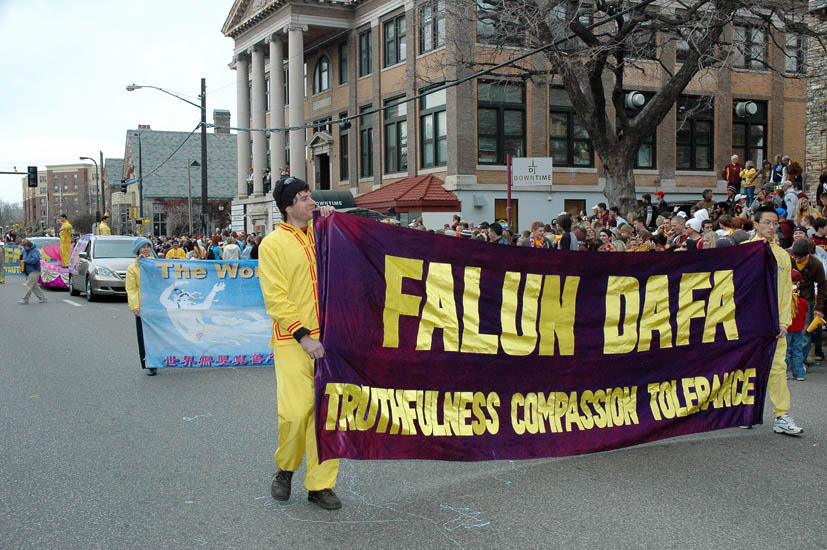 【明慧网二零零七年十一月六日】二零零七年十一月三日,美国明州法轮功学员第五次参加了明尼苏达大学传统的返校节(Home Coming)游行。在以往明州大学返校游行的时候,常常是寒冷甚至下雨下雪,而今年的天气却格外宜人。