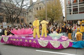 下午两点,游行正式开始。当举着「世界需要真善忍」的横幅、穿着整齐炼功服的法轮功学员以及极具东方神韵的花车出现在大学大道的时候,立即吸引了路边观众的注意,他们报以热情的欢呼。