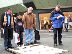 ![]() 不同阶层、不同年龄的德国民众关注法轮功真相。有逛街的人们停下脚步专注的阅读、也有祖孙三代一起来的了解真相的。 |
