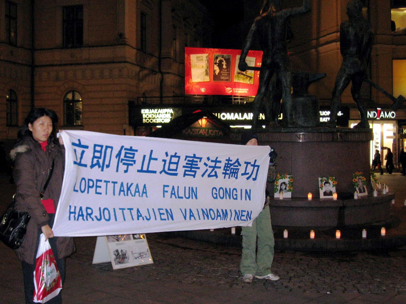 冬日下午四点多的赫尔辛基,天已全黑了,只见街头圣诞彩灯高悬,美不胜收,人们正匆忙汇入年末的购物高潮中。但法轮功学员,却早早申请到这人流密集的地方,摆放好部份被迫害致死同修的遗像,点燃蜡烛,拉起“立即停止迫害法轮功”的横幅,呼吁人们共同起来制止中共暴行,结束“这个星球上前所未有的邪恶”——对法轮功学员的虐杀。