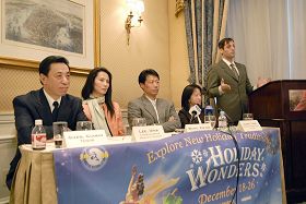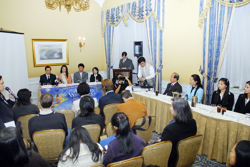 【明慧网二零零七年十二月十四日】(明慧记者黄凯莉报导)新唐人圣诞晚会将于二零零七年十二月十八日,分别在美国纽约百老汇与巴尔的摩两地同时拉开序幕。十三日中午,美国神韵艺术团在纽约曼哈顿华尔道夫(Waldorf Astoria)酒店召开记者会,部份主要担纲演员亮相,并介绍晚会。团长关贵敏先生表示,这么阵容庞大、表现纯真、纯善、纯美的中华文化的一流演出,在全世界,可以说是独一无二、绝无仅有的;此晚会将在全世界六十多个城市巡回演出,预期六十多万现场观众。