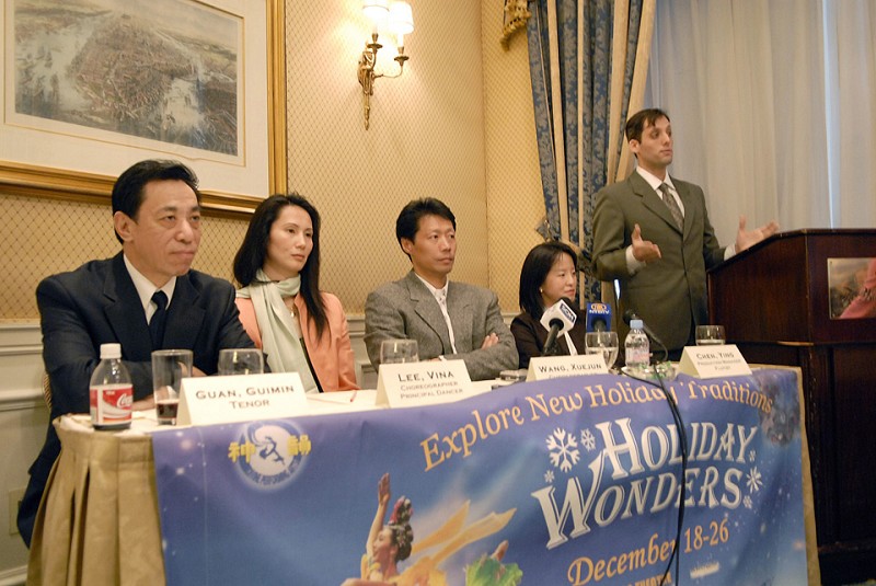 新唐人圣诞晚会新闻发布现场,左起:神韵艺术团团长关贵敏,李维娜、王学军伉俪,舞台总监陈缨,主持人林理善。