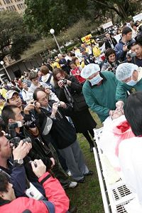 ![]() 澳洲:由“自由中国”主办、二十多个团体协办、以“中共必须立即停止屠杀”为主题的大型集会游行,二零零七年九月六日在悉尼市中心举行。集会上和游行队伍中最为引人注目的是揭露中共活摘法轮功学员器官的模拟演示,从始至终都是众多媒体争相拍照的目标。 |