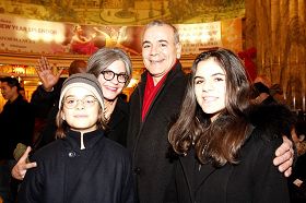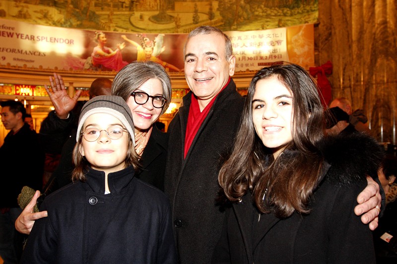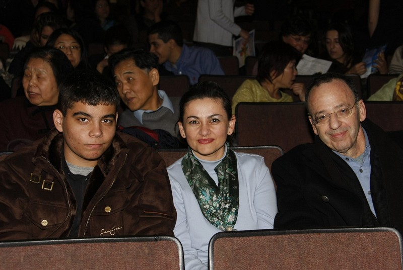 来自罗马尼亚的Steven Schulman(右一),担任企业的执行长,今天他与太太、儿子一家人买了最贵的票来看演出。Schulman夫人说:“我一直在流泪,因为我被神韵纽约艺术团的美打动了!”她认为歌唱家的歌声富有灵性,服装、天幕背景真的都很美,舞蹈演员的舞姿优雅,女性的动作很高贵,男性的动作很阳刚。