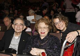 曾任教三十五年音乐的斯克劳斯(Mirian Schloss)(右)与父母。她的母亲莱文恩(Bernice Levine)年轻时是芭蕾舞业余演员。莱文恩认为,中国舞蹈更胜于芭蕾。斯克劳斯是第一次欣赏到中西乐器的合奏。她说:“西洋乐与中国乐器结合奏出的旋律,真的是非常复杂,非常富有生动的表现力,更有深度,更好的表达历史。”