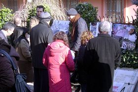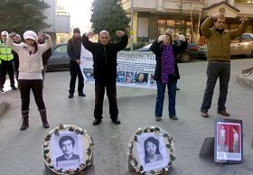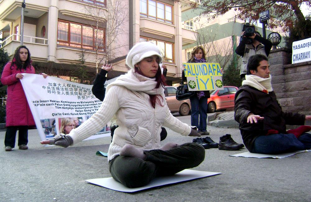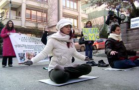 在一个多小时的抗议活动中,一部份学员向执勤的警察、围观的民众以及前来采访的记者发了真相材料,向他们揭露了八年多来中共政权对广大法轮功学员所犯下的群体灭绝罪行,其余学员则展示了优美舒缓的法轮功五套功法。