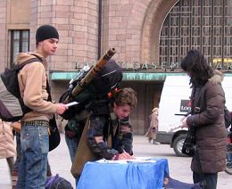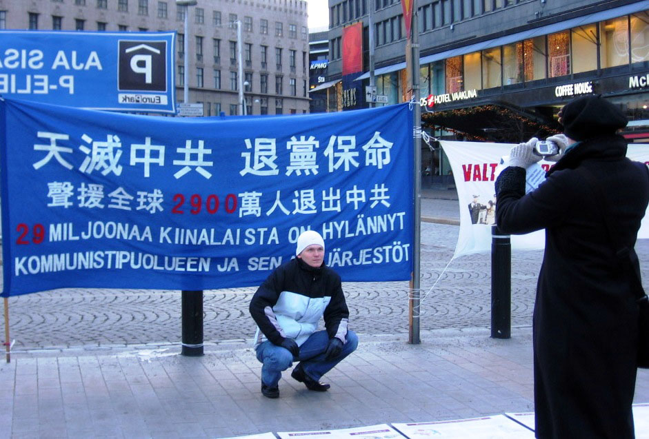 冬日的赫尔辛基寒风阵阵,冻的人们紧缩脖颈匆忙赶路,但活动地点用英文播放的《九评共产党》和中、芬文的“天灭中共 退党保命 声援2900万人退出中共”横幅及法轮功受迫害真相展板和横幅,却吸引来不少民众直奔征签桌前签名声援。