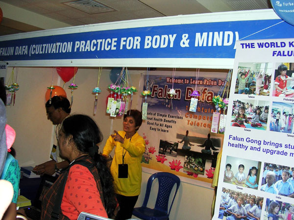印度全国学校协会有五十年历史,在今年特别盛大举行为期三天的(十一月二十八日~三十日)五十周年庆。这是个很特别的日子,印度法轮佛学会为了推广法轮功,让全印度人民受益,还特别在会场申请摊位播放影片,为与会校长们及来宾介绍法轮功的特色及法轮功在全世界的洪传盛况,并由来自台湾及马来西亚学员现场教授功法。是上百个摊位中参观人数最多的摊位。