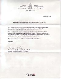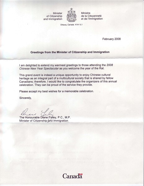 ![]() 加拿大联邦政府移民部部长戴安•菲丽(Diane Finley)的贺信 |