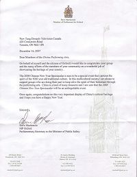 加拿大公共安全部长国会秘书戴夫•麦坎西(Dave Mackenzie)致信神韵艺术团,祝贺该团和其他许许多多的华人社区的人士能够成功的展现自己的文化传统。“二零零八年的华人晚会一定会把五千年的华夏传统展现出来。”戴夫•麦坎西说,“在我们这个多元文化的社会,我非常高兴能够支持你们的晚会,你们正在通过艺术表演的形式保持自己的民族精神。”