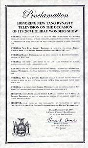 鉴于,新唐人电视台将中华文化的精髓带到纽约,并呈现给全世界,新唐人电视台因其不懈的努力应受到赞美;并且,