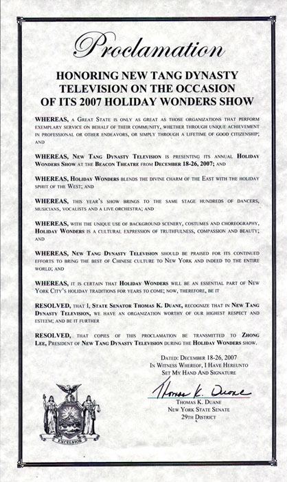 因此,现在决定,我,汤姆斯•杜恩(Thomas K. Duane),纽约州参议员,表彰新唐人电视台,新唐人电视台值得我们给予最高的敬意和爱戴。