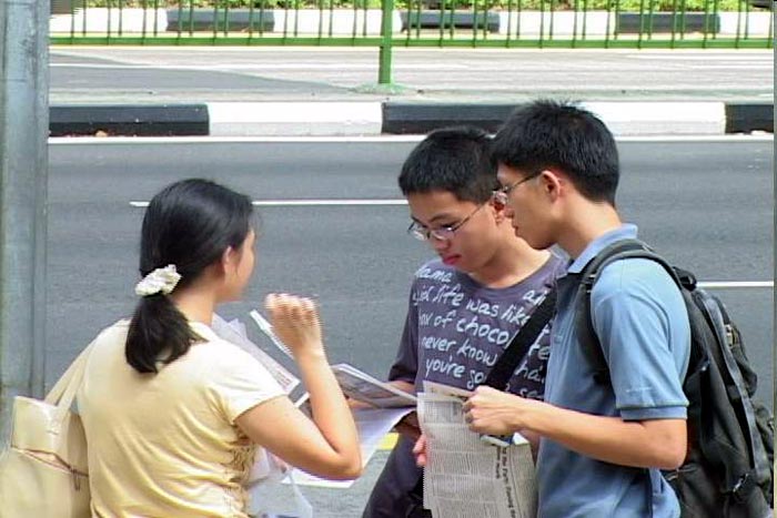 法庭外,法轮功学员向新加坡民众讲真相