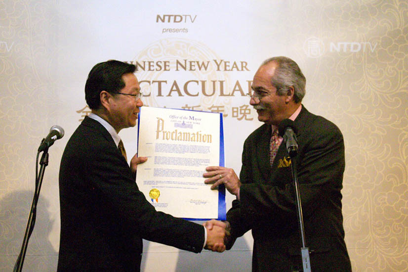 ![]() 图说:纽约市长彭博定2007年2月14日为“新唐人华人新年晚会日”。图为纽约市长办公室移民事务局局长格维勒默•李纳尔斯(GUILLERMO LINARES)代表市长彭博向新唐人总裁李琮颁发褒奖。 |