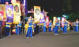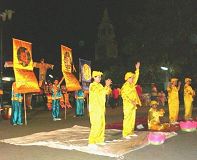 法轮功学员演示了功法、龙旗、腰鼓、唱歌,以及优美的舞蹈「梅」、「仙女舞」等精彩的节目,展现了法轮大法的美好和修炼者的风貌,获得了阵阵掌声。由明慧学校的小弟子们表演的歌舞「大法小弟子」,纯洁可爱,天真活泼,给全场增添了欢乐的气氛。法轮功学员还当场教观众唱「法轮大法好」,并祝大家新年快乐。现场气氛非常溶洽。
