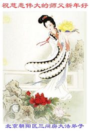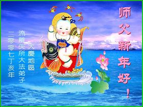 师父您好!弟子一定更加精進,努力做好三件事,在这有限的时间中,抓紧救度世人,兑现自己的史前誓约。弟子一定加倍努力,助师正法,但愿师父能少一分操劳。在此给慈悲伟大的师尊拜年!
